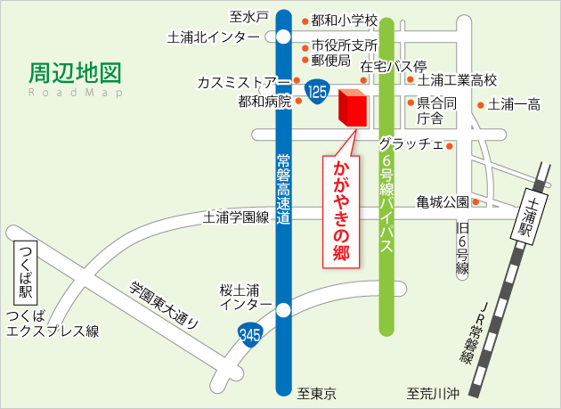 ⇒「土浦北」インターまで約45分、「土浦北」から当ホームまで車で5分(2.5km)です。