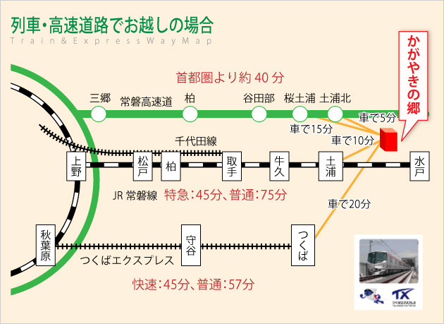 ⇒「桜土浦」インターまで約40分、「桜土浦」から当ホームまで車で15分(8km)です。